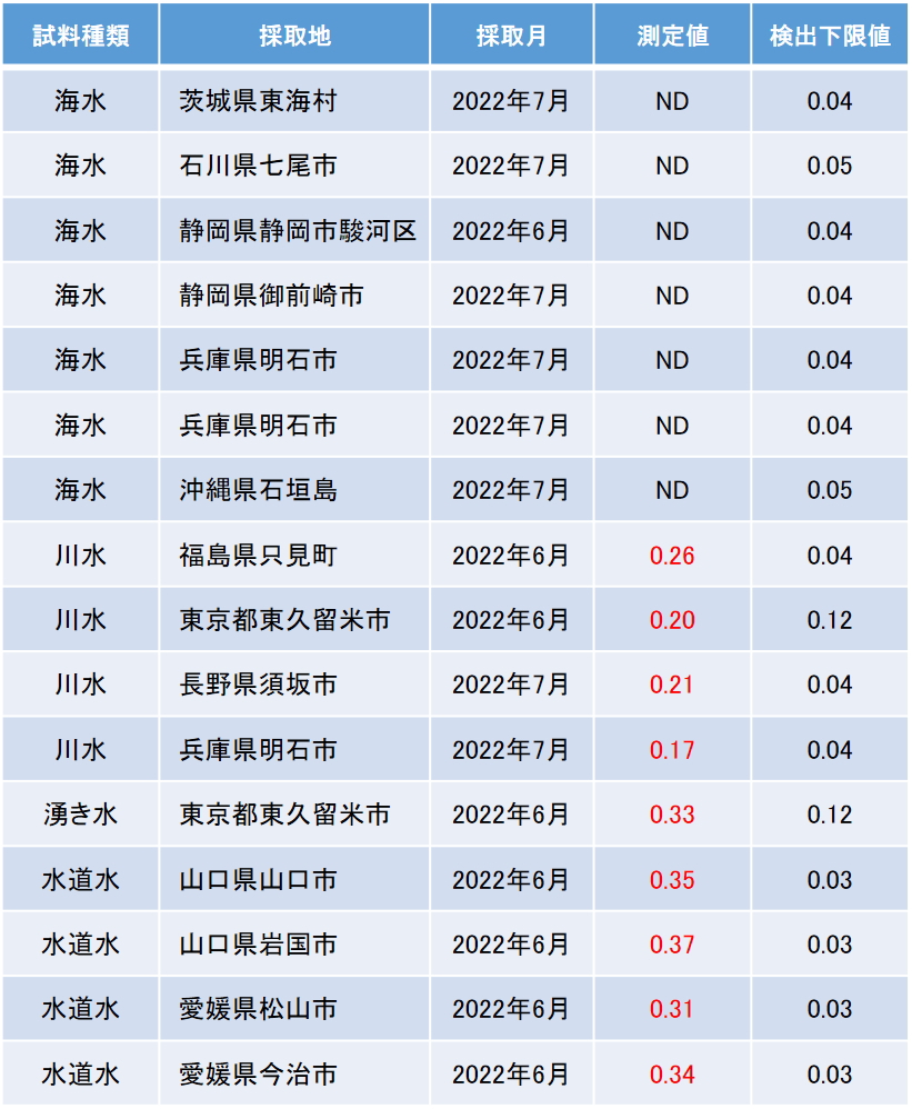 全国の海水・陸水のトリチウム測定結果(Bq/リットル)